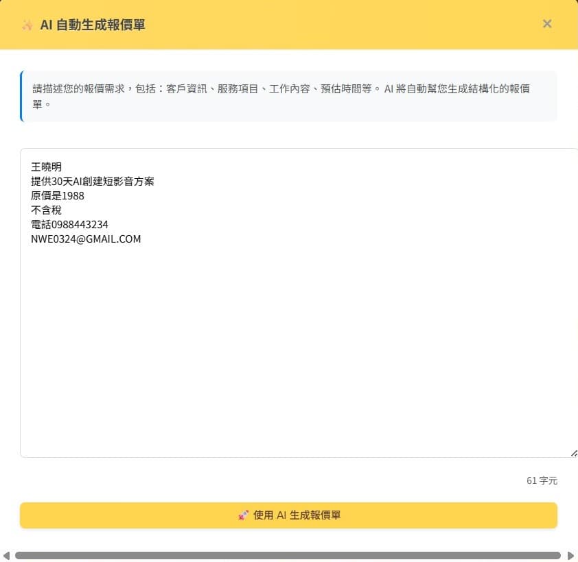 • AI 一鍵生成:只要輸入客戶名與服務,系統自動抓取歷史紀錄,1 分鐘內產出美觀專業的木工報價單