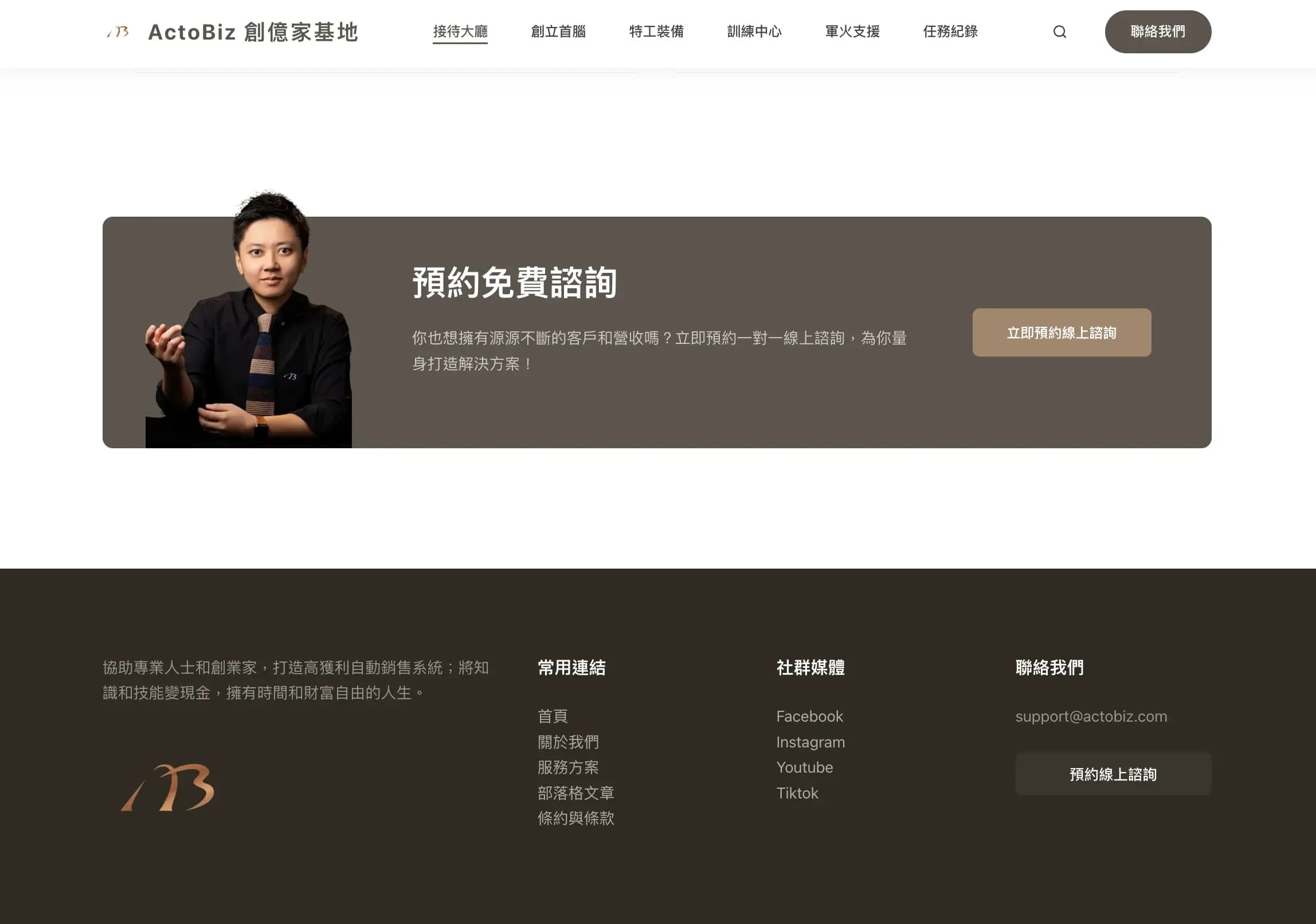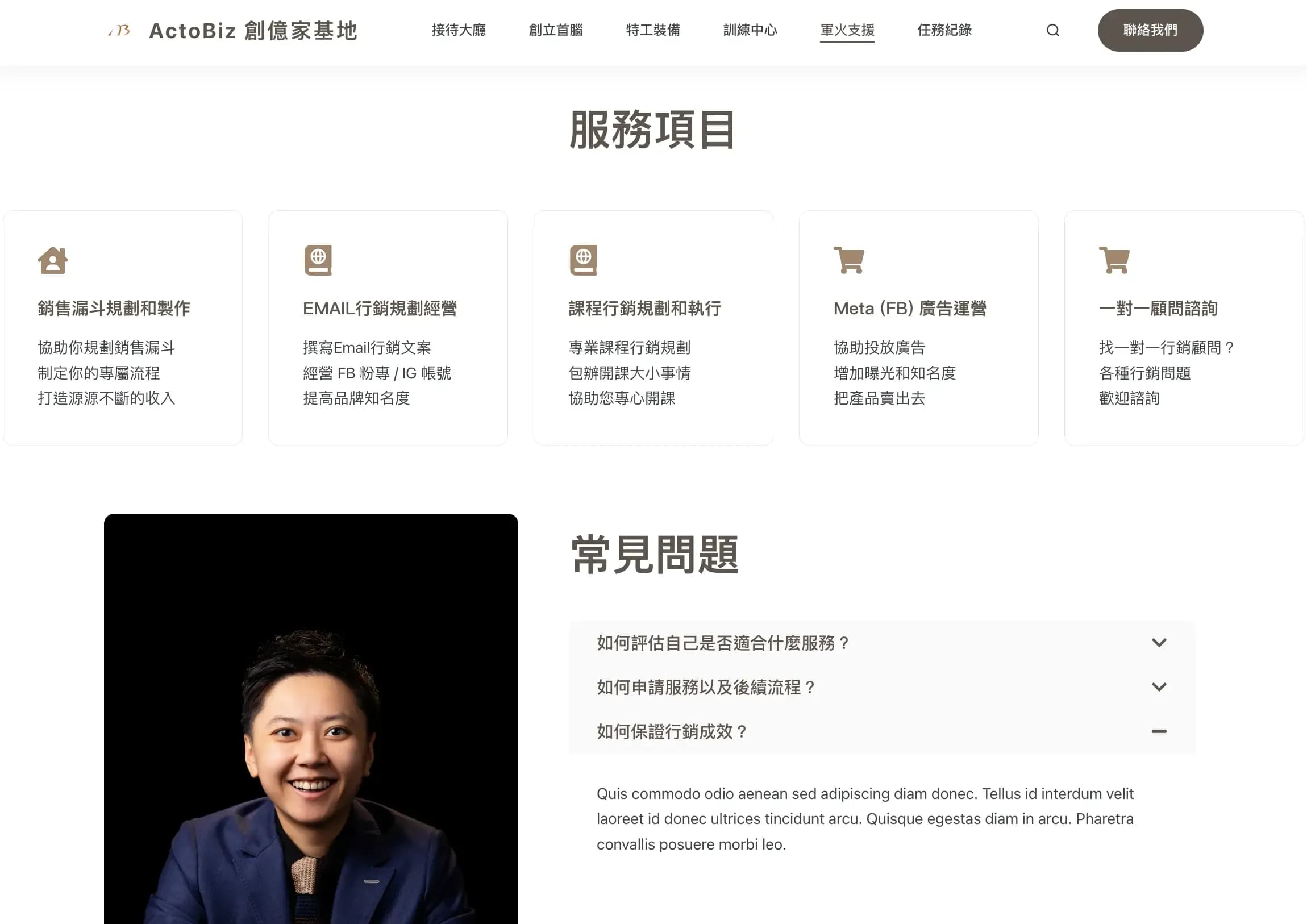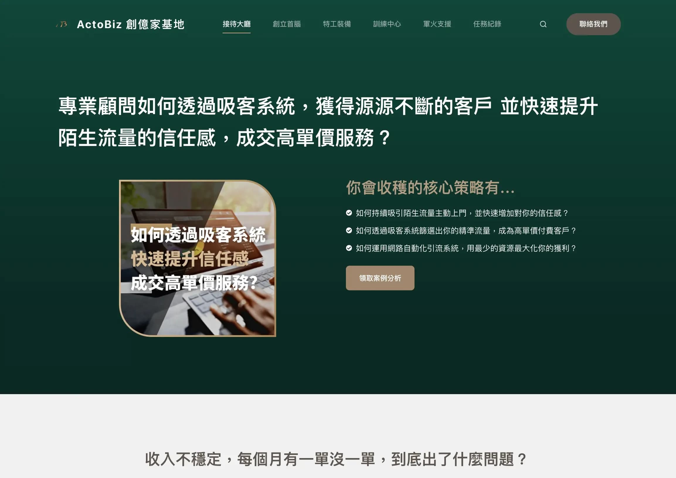 Actobiz 是一家以創業孵化、創新加速為核心的顧問品牌。他們過去委外製作的網站設計老舊、版型雜亂,不僅無法傳遞品牌專業感,且每月還需支付高昂的維運費,維修需求回應速度慢、報價不透明網站無法為專業性背書的問題漸漸浮現。